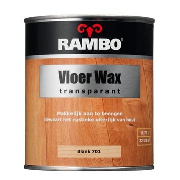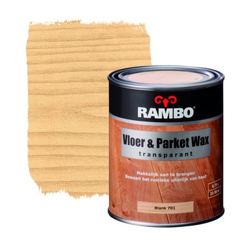 De Rambo vloer- en parketwax blank transparant 750 ml is een wax waarmee je een beschermende laag op je vloer of parket kunt aanbrengen. De wax weert vocht en zorgt ervoor dat het hout zijn rustieke uiterlijk behoudt. Het is geschikt voor vloeren, vloerdelen en betimmeringen. De wax is makkelijk aan te brengen en is waterafstotend. Het blik bevat 750 milliliter blanke transparante wax, dit is genoeg voor een oppervlakte van zo'n 22 tot 30 vierkante meter. Bij transparante wax is het raadzaam om een blanke laag als eerste laag aan te brengen, om kleurbontheid te voorkomen.
