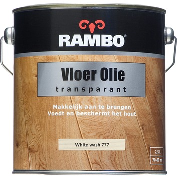 De Rambo vloerolie white wash transparant 2,5 liter is geschikt voor met wasolie behandelde vloeren. De olie is een transparante verzorgende olie voor vloeren en ideaal voor houtsoorten met een open structuur of houtsoorten die al zijn behandeld met wasolie. De olie is geschikt voor vloeren, vloerdelen en betimmeringen. Het is makkelijk aan te brengen en is waterafstotend. Het blik bevat 2,5 liter white wash transparante vloerolie, dit is genoeg voor een oppervlakte van zo'n 70 tot 80 vierkante meter. Bij transparante olie is het raadzaam om een blanke laag als eerste laag aan te brengen, om kleurbontheid te voorkomen.
