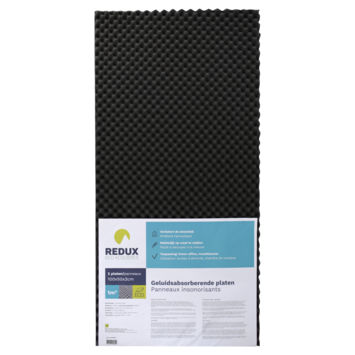 De Redux geluidsabsorberende plaat zwart 100 x 50 cm 30 mm 2 stuks gebruik je om de akoestiek in een ruimte te verbeteren. In elke verpakking zitten twee platen van polyurethaan (PUR) die samen een oppervlakte van 1 m² dekken. Het materiaal is geluidswerend en dempt echo’s zodat het aangenamer klinkt. Omdat de platen dampdoorlatend zijn, blijft de lucht circuleren terwijl het geluid wordt geabsorbeerd. Je kunt ze toepassen op muren of daken waardoor je verschillende ruimtes stiller maakt.