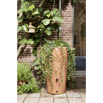 De Waterform regenton Tube in terracotta valt op door het ronde ontwerp en de warme kleur. Met een inhoud van 230 liter vang je eenvoudig regenwater op voor je tuin. De regenton is 109,5 cm hoog en heeft een diameter van 59,3 cm, waardoor hij weinig ruimte inneemt maar toch veel water opslaat. Bovenop zit een geïntegreerde plantenbak waarin je bloemen of kruiden kwijt kunt. Dat maakt de regenton niet alleen functioneel, maar ook decoratief. Het kraantje wordt niet meegeleverd, maar is makkelijk te installeren. Dankzij het wintergat maak je de ton snel leeg als het gaat vriezen. Handig en stijlvol tegelijk.