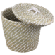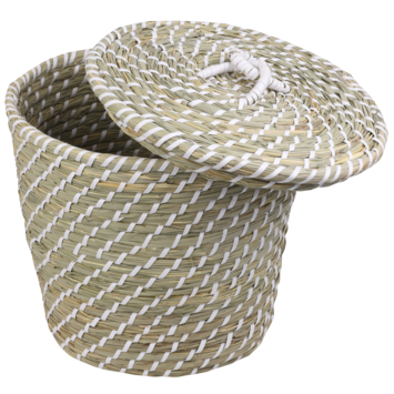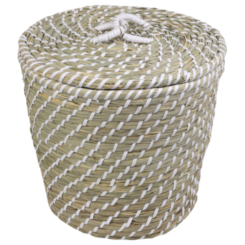 Deze ronde rietenmand is praktische blikvanger. Alles netjes opgeborgen met bijbehorende deksel.
