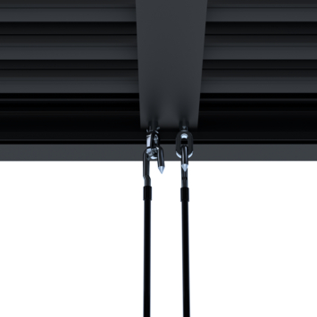 De pergola heeft een verstelbare schutterdak met draaibare lamellen, deze kunnen open of dicht gedraaid worden met een draaistang. Door deze dicht te draaien ben je beschut tegen de zon en is deze gelijk spat waterdicht bij regen. Deze kan ook open gedraaid worden op zonnige dagen. De twee helften op het dak kunnen afzonderlijk van elkaar versteld worden.