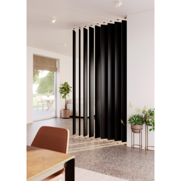 Een trendy afscheiding maken in uw woning was nog nooit zo eenvoudig. Met deze draaibare lamellen maakt u een afscheidingswand die makkelijk te monteren is. Na montage kunt u de lamellen verdraaien naar eigen wens. Deze roomdivider is verkrijgbaar in 3 kleuren: zwart, wit en eik. Deze divider bestaat ook in ellips vormige variant.