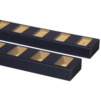 Een complete roomdivider bestaat uit drie onderdelen: de spijlen, de profielen en de montagetape. De profielen vormen het raamwerk van de wand en hebben uitsparingen waarin de spijlen worden geplaatst. Hierdoor ontstaat een stevige constructie zonder zichtbare bevestiging. Deze rechte versie zorgt ervoor dat de lamellen haaks op de vloer staan, wat de ruimte een strakke en evenwichtige indeling geeft.