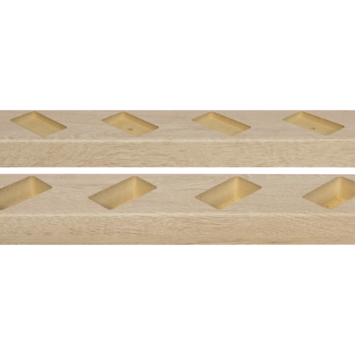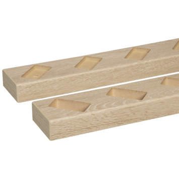 Het Roomdivider profiel schuin 45° natuur eiken 2 stuks vormt de boven- en onderzijde van de CanDo roomdivider. Deze profielen werken als rails waarin de spijlen stevig vastzitten onder een hoek van 45 graden. Zo creëer je een open wand met een speelse doorkijk die licht doorlaat maar toch voor afscheiding zorgt. De natuur eiken afwerking geeft de roomdivider een warme, natuurlijke uitstraling die past in elk interieur.