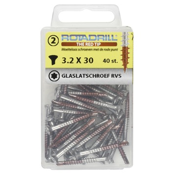 Rotadrill® Glaslatschroeven zijn hele dunne schroefjes met boorpunt gemaakt van speciaal gehard RVS-410. Met deze schroeven kun je probleemloos glaslatten en andere latjes of plinten vastschroeven, zelfs zonder voorboren. De speciale boorpunt voorkomt hierbij het splijten van het hout. Het kleine lenskopje met freesribben onder de kop zorgt voor een mooie afwerking. De Torx aandrijving zorgt voor meer grip en een optimale krachtoverbrenging. De rode punt aan de Rotadrill® schroeven is een gepatenteerd smeermiddel dat er voor zorgt dat de schroeven zeer licht indraaien voor optimaal schroefgemak. Geleverd in een stevige kunststof bewaarverpakking.