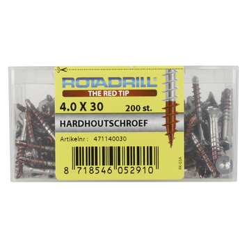 Rotadrill® Hardhoutschroeven zijn gemaakt van speciaal gehard RVS 410. Deze RVS soort is twee keer zo sterk als RVS A2 waardoor je moeiteloos kunt inschroeven zonder afbreken tijdens het indraaien. De speciale boorpunt aan de Hardhoutschroeven zorgt voor probleemloos verwerken in hardhout en maakt voorboren in de meeste gevallen overbodig. Zonder het hout te splijten. De platkop met freesribben onder de kop zorgt voor een nette verzonken afwerking van de schroef in het hout en de Torx aandrijving zorgt voor meer grip en een optimale krachtoverbrenging. De rode punt aan de Rotadrill® schroeven is een gepatenteerd smeermiddel dat er voor zorgt dat de schroeven zeer licht indraaien voor optimaal schroefgemak. Geleverd in een stevige kunststof bewaarverpakking.
