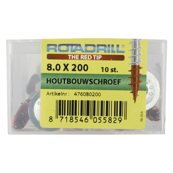 Rotadrill® Houtbouwschroeven zijn bedoeld voor het verbinden van houten balken en dragende houtconstructies. Door de brede tellerkop hebben de schroeven een groot draagvlak en klembereik. Hierdoor kun je stevige verbindingen maken tussen houten balken. Tevens zijn deze schroeven een ideale vervanger voor de ouderwetse houtdraadbouten: sterker, een hogere uittrekwaarde en vele malen gebruiksvriendelijker door gemakkelijk inschroeven met een (slag)boormachine. Door de Torx-aandrijving op deze schroeven heb je meer grip en een optimale krachtoverbrenging op de schroef . Hierdoor kun je gemakkelijker inschroeven. De rode punt aan de Rotadrill® schroeven is een gepatenteerd smeermiddel dat er voor zorgt dat de schroeven zeer licht indraaien voor optimaal schroefgemak. Hierdoor zijn de schroeven zeer gemakkelijk te verwerken in verschillende bouwstoffen. Geleverd in een stevige kunststof bewaarverpakking. In iedere kuip-verpakking wordt gratis het bijpassende Torx bitje meegeleverd.