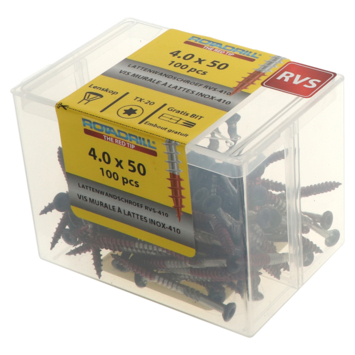 Zoek je een goede schroef die bij je lattenwand voor buiten of ander tuinhout kunt gebruiken? Ga dan voor de Rotadrill lattenwandschroef torx rvs-410 4.0x50 mm 100 stuks. Deze schroef heeft een zwarte lenskop en verzinkt dus mooi in de zwarte latten van de lattenwand of in zweeds rabat. De schroef heeft een torxkop van het type T20. Je kunt hem dus met een torx-bitje of schroevendraaier indraaien. Er zit een gratis bitje in het doosje!
