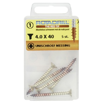 Rotadrill® messing schroeven zijn voornamelijk geschikt voor siertoepassingen bijvoorbeeld voor gebruik in messing scharnieren of in messing deurbeslag. De rode punt aan de Rotadrill® schroeven is een gepatenteerd smeermiddel dat er voor zorgt dat de schroeven zeer licht indraaien voor optimaal schroefgemak. Hierdoor zijn de schroeven zeer gemakkelijk te verwerken in verschillende bouwstoffen. Geleverd in een stevige kunststof bewaarverpakking.
