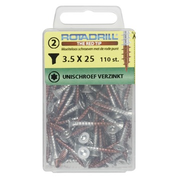 Rotadrill® Universeelschroeven Platkop Verzinkt Torx zijn bedoeld voor gebruik binnenshuis in hout of in een plug. Met de Torx-schroeven heb je veel meer grip door de optimale krachtoverbrenging van het bitje op de schroef. Hierdoor kun je gemakkelijk schroeven. De rode punt aan de Rotadrill® schroeven is een gepatenteerd smeermiddel dat er voor zorgt dat de schroeven zeer licht indraaien voor optimaal schroefgemak. Hierdoor zijn de schroeven zeer gemakkelijk te verwerken in verschillende bouwstoffen. De platverzonken kop verzinkt netjes in het hout bij het aanschroeven en is bedoeld voor hout-op-hout verbindingen. Geleverd in een stevige kunststof bewaarverpakking.