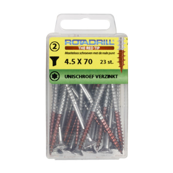 Rotadrill® Universeelschroeven Platkop Verzinkt Torx zijn bedoeld voor gebruik binnenshuis in hout of in een plug. Met de Torx-schroeven heb je veel meer grip door de optimale krachtoverbrenging van het bitje op de schroef. Hierdoor kun je gemakkelijk schroeven. De rode punt aan de Rotadrill® schroeven is een gepatenteerd smeermiddel dat er voor zorgt dat de schroeven zeer licht indraaien voor optimaal schroefgemak. Hierdoor zijn de schroeven zeer gemakkelijk te verwerken in verschillende bouwstoffen. De platverzonken kop verzinkt netjes in het hout bij het aanschroeven en is bedoeld voor hout-op-hout verbindingen. Geleverd in een stevige kunststof bewaarverpakking.