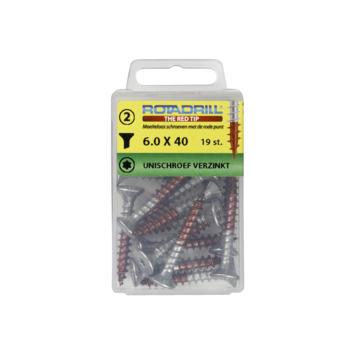 Rotadrill® Universeelschroeven Platkop Verzinkt Torx zijn bedoeld voor gebruik binnenshuis in hout of in een plug. Met de Torx-schroeven heb je veel meer grip door de optimale krachtoverbrenging van het bitje op de schroef. Hierdoor kun je gemakkelijk schroeven. De rode punt aan de Rotadrill® schroeven is een gepatenteerd smeermiddel dat er voor zorgt dat de schroeven zeer licht indraaien voor optimaal schroefgemak. Hierdoor zijn de schroeven zeer gemakkelijk te verwerken in verschillende bouwstoffen. De platverzonken kop verzinkt netjes in het hout bij het aanschroeven en is bedoeld voor hout-op-hout verbindingen. Geleverd in een stevige kunststof bewaarverpakking.