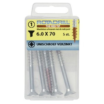Rotadrill® Universeelschroeven Platkop Verzinkt Pozi zijn bedoeld voor gebruik binnenshuis in hout of in een plug. De rode punt aan de Rotadrill® schroeven is een gepatenteerd smeermiddel dat er voor zorgt dat de schroeven zeer licht indraaien voor optimaal schroefgemak. Hierdoor zijn de schroeven zeer gemakkelijk te verwerken in verschillende bouwstoffen. De platverzonken kop verzinkt netjes in het hout bij het aanschroeven en is bedoeld voor hout-op-hout verbindingen. Geleverd in een stevige kunststof bewaarverpakking.