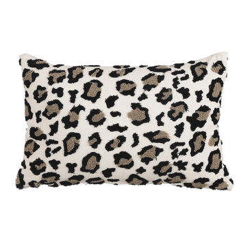Haal de jungle in huis met dit beige Roxanne kussen! Het kussen is voorzien van een mooie panterprint in de kleuren lichtbruin en zwart. De panterprint is gemaakt van franjes en knopjes die het kussen afmaken en gelijk zorgen voor een speelse uitstraling. Leuk voor op de bank of in een mooie fauteuil. De afmetingen zijn L55 x B35 cm.