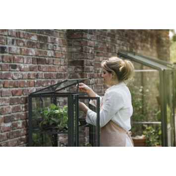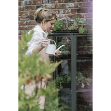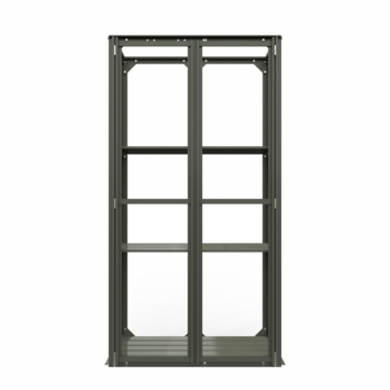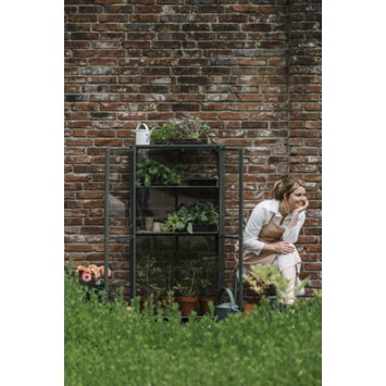 De Urban Grower large van Royal Well is een slimme oplossing als je weinig ruimte hebt, maar toch kruiden of groente wilt kweken. Deze kweekkast is compact maar ruim genoeg om meerdere potten of bakken in kwijt te kunnen. De kast is gemaakt van gecoat aluminium in grijsgroen, met stevige wanden van 3 mm dik polycarbonaat. Dat materiaal laat licht door maar is veel minder breekbaar dan glas. Je opent de kast via de dubbele deuren aan de voorkant. Het dakraam kun je op een kier zetten of helemaal open voor frisse lucht. De binnenste schappen zijn makkelijk te verplaatsen. Zo kun je de indeling aanpassen aan je planten. Montage is eenvoudig, alle onderdelen zijn inbegrepen.