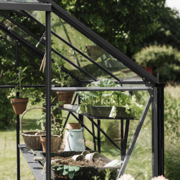 Met dit zwarte kweekschap voor tuinkas Kate I zorg je eindelijk voor een opgeruimde kas. Geen rondslingerende potjes, gereedschap of zaadjes meer – alles krijgt een vaste plek! Dankzij de twee stevige leggers creëer je extra opslagruimte en bied je jonge plantjes de ideale groeiomgeving. Het handige aan dit schap is dat je de hoogte zelf kunt instellen, zodat het altijd perfect in jouw kas past. De robuuste constructie zorgt ervoor dat alles stevig blijft staan, zelfs als het schap helemaal vol staat. Met een diepte van 22,5 cm is het geschikt voor iedere kasmaat en maak je optimaal gebruik van de beschikbare ruimte. Dit kweekschap helpt je om efficiënter en georganiseerder te werken in je kas!