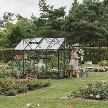 De Royal Well Mary II kweekkas in zwart biedt een perfecte combinatie van stijl en functionaliteit voor iedere tuinier. Met een binnenoppervlakte van 6,0 m² kun je een breed scala aan planten een fijne plek geven om te groeien. Het fraaie zadeldak en de schuifdeur geven de kas niet alleen een chique uitstraling, maar zorgen ook voor een praktische indeling. Het 3 mm dikke veiligheidsglas biedt uitstekende bescherming voor je planten, en dankzij de foamtape demping is de installatie eenvoudig en snel. De stevige fundering die bij de kas wordt geleverd zorgt ervoor dat de kas zelfs op onverharde ondergronden stabiel staat. De dakgoten en regenpijpen maken het mogelijk om regenwater op te vangen en te gebruiken voor je planten. De royale nokhoogte van 241 cm maakt het werken in de kas comfortabel. Het Full Options pakket biedt je alles wat je nodig hebt, van schappen tot tomatenspiralen, zodat je meteen kunt beginnen met je tuinavontuur!