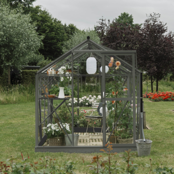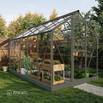 De Royal Well Mary III kweekkas in groengrijs is een echte aanwinst voor je tuin. Met een royale binnenruimte van 7,46 m² kun je al je favoriete planten laten groeien. Het stijlvolle zadeldak en de schuifdeur maken het niet alleen een praktische werkruimte, maar geven de kas ook een luxe uitstraling. Het Full Options pakket biedt alles wat je nodig hebt om direct aan de slag te gaan, inclusief een geïntegreerd schap en handige containers voor je potgrond. De veiligheidsglazen wanden beschermen je planten tegen de weersomstandigheden, terwijl de automatische raamopener zorgt voor de juiste ventilatie. Dit is de perfecte kas voor de gepassioneerde tuinier!