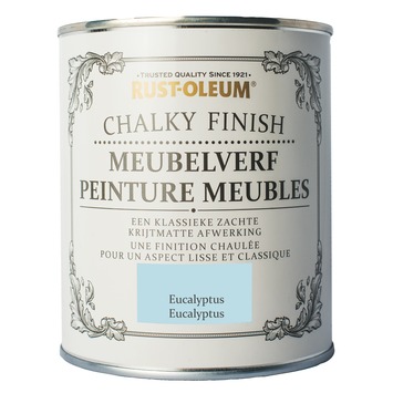 Rust-oleum Chalky Finish Meubelverf Eucalyptus 750 ml is perfect om oude en nieuwe meubels een nieuwe uitstraling te geven. De verf mag rechtstreeks op hout (blank of geverfd), baksteen, steen, pleister of elk ander voorbehandeld hard oppervlak worden aangebracht. Creëer een Shabby-chic look door twee lagen in contrasterende kleuren aan te brengen en deze lichtjes te schuren wanneer ze droog zijn. Werk voor een optimaal resultaat de Rust-oleum Chalky Finish Meubelverf Eucalyptus 750 ml af met een beschermende laag Rust-oleum meubelwas 400 ml of Rust-oleum Meubelvernis mat 125 ml.