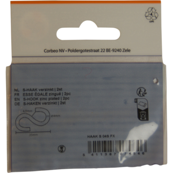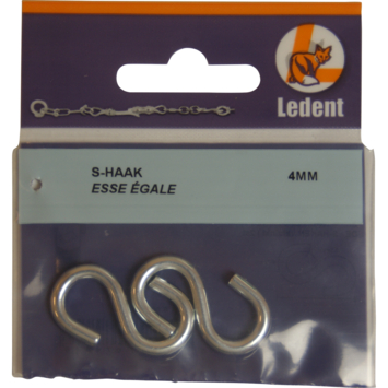 Open S-haken zijn handig om allerlei voorwerpen aan op te hangen, zoals keukengerei of gereedschap. Deze verzinkte S-haken zijn 4mm dik en 4cm lang. Ze zijn per 2 stuks verpakt in een blister.