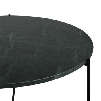 Deze ronde salontafel Vicky heeft een groot groen marmer blad en een slank zwart inklapbaar frame. De salontafel heeft een diameter van 70 cm en een hoogte van 37 cm.