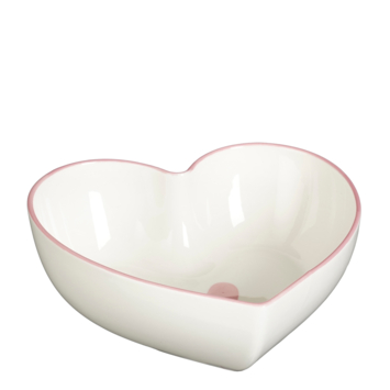 Deze hartvormige schaal van keramiek voegt liefde toe aan elk eetmoment. De roze details en het kleine hartje in het midden zorgen voor een speelse, zachte uitstraling. Ideaal voor het serveren van fruit, kleine lekkernijen of als een snackbakje. Ook leuk als decoratief item op een mooi gedekte tafel. De afmetingen zijn L18 x B17 x H6 cm.