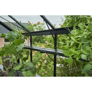 Dit zwarte geïntegreerde aluminium kweekschap is precies passend leverbaar voor de Birdlip 48. De lengte van het schap is gelijk aan de binnenmaat van de langste zijde van de kas. De hoogte is instelbaar is voor een optimale werkhouding, dus zaaien en kweken op stahoogte! Dit schap heeft een breedte van 18,2 cm.