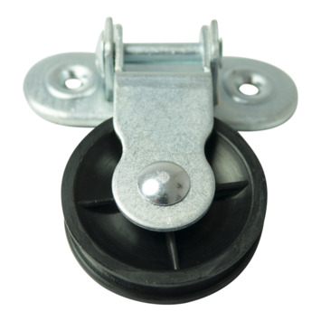 Scharnierkatrol met polypropyleen wiel 40 mm. De katrol is uitsluitend voor binnengebruik en heeft een maximale belasting van 20kg.