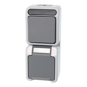 Merten opbouw wisselschakelaar/stopcontact combinatie met randaarde 1-polig is spatwaterdicht (beschermingsklasse IP44), dus geschikt voor vochtige ruimtes en buitengebruik. Deze grijze opbouw wisselschakelaar/stopcontact heeft een maximaal belastbaar vermogen van 2300 watt.