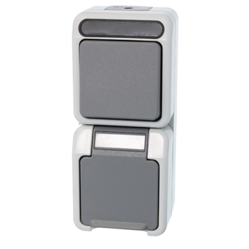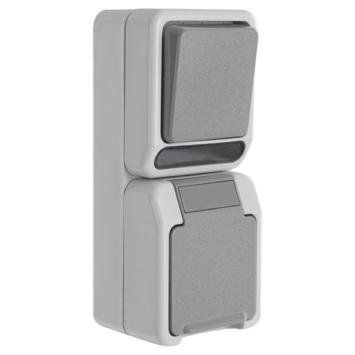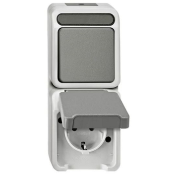 Merten opbouw wisselschakelaar/stopcontact combinatie met randaarde 1-polig is spatwaterdicht (beschermingsklasse IP44), dus geschikt voor vochtige ruimtes en buitengebruik. Deze grijze opbouw wisselschakelaar/stopcontact heeft een maximaal belastbaar vermogen van 2300 watt.
