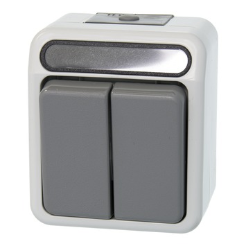Met deze grijze Schneider Electric Merten Contura opbouw serieschakelaar kun je twee verschillende lichtpunten (bijvoorbeeld het lichtpunten garage- en buitenlamp) vanaf één plaats in- en uitschakelen. Deze serieschakelaar is spatwaterdicht (beschermingsklasse IP44), dus geschikt voor vochtige ruimtes en buitengebruik. Maximaal aansluitvermogen 2300 watt. Een serieschakelaar is niet te gebruiken als wisselschakelaar. Hiervoor gebruik je de wissel-wisselschakelaar.