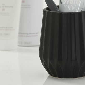 De Sealskin Arte Beker Zwart is de perfecte aanvulling voor jouw badkamer of toilet. Met zijn strakke, geometrische vorm en stijlvolle rubber finish geeft deze beker een moderne uitstraling. Of je hem nu gebruikt als tandenborstelhouder of voor het opbergen van scheermesjes en oogpotloden, deze multifunctionele beker maakt het eenvoudig om alles georganiseerd te houden. Je hoeft je geen zorgen te maken over het gebruik, want hij is praktisch in onderhoud; een vochtig doekje is al genoeg om hem schoon te maken. Het keramische materiaal zorgt ervoor dat hij stevig en stevig is, zodat je er lang plezier van hebt. Kortom, deze beker is niet alleen functioneel, maar ook een echte eyecatcher in jouw interieur.