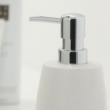 De basis van dit zeeppompje is van keramiek en het pompje is van plastic.