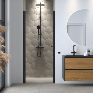 Dankzij Hooked geniet je van een aangename douchebeleving. De royale hoogte van 2 meter houdt de warmte vast, zodat douchen comfortabeler wordt. Het matzwarte frame geeft een trendy en stoere uitstraling, terwijl het minimalistische profiel stevig blijft en eenvoudig te onderhouden is. De deuren zijn omkeerbaar, zodat je ze links- of rechtsdraaiend kunt plaatsen en altijd passend bij jouw badkamerindeling.