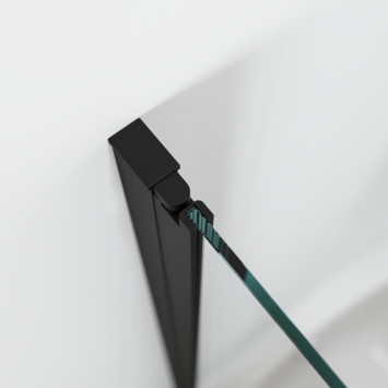 De draaideur is vervaardigd van 6 mm gehard veiligheidsglas met antikalklaag. Het matzwarte frame is strak afgewerkt en de schroeven zijn onzichtbaar weggewerkt voor een nette, moderne look.