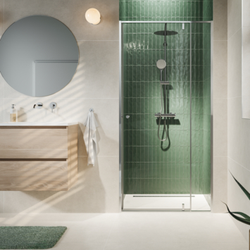 De draaideur scharniert niet direct aan de muur, waardoor je nooit tegen een radiator of badkameraccessoire stoot. Met een hoogte van 2 meter blijft de warmte in de douche behouden, waardoor douchen comfortabeler wordt. Het minimalistische frame en de uit het zicht geplaatste schroeven geven de badkamer een overzichtelijke en luxe uitstraling zonder overbodige details.