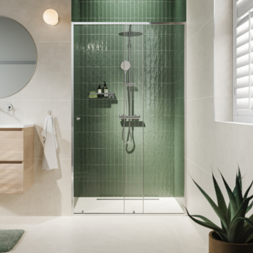 Deze schuifdeur is een slimme keuze voor wie weinig ruimte heeft, maar wel een luxe uitstraling wil. Doordat de deur schuift in plaats van draait, blijft er meer bewegingsvrijheid in de badkamer. Het heldere glas laat licht door en geeft een open, ruimtelijk effect. Met de subtiele greep open en sluit je de deur moeiteloos. De ribbelstructuur van de greep biedt extra grip en voelt solide aan.