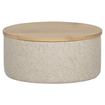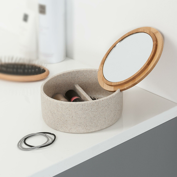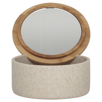 Met het Sealskin Spiegeldoosje Grace Zand haal je een stijlvol en multifunctioneel accessoire in huis. Dit prachtige doosje, vervaardigd uit kunsthars, heeft een elegant zandkleurig uiterlijk dat doet denken aan natuurlijk steen. Het deksel is prachtig afgewerkt met een bamboe accent en herbergt een handig spiegeltje, perfect voor een snelle touch-up of het aanbrengen van make-up. Je kunt er niet alleen sieraden in opbergen, maar het doosje kan ook als make-up spiegel gebruikt worden door het spiegeltje in de speciale inkepingen te plaatsen. Dit spiegeldoosje is eenvoudig te reinigen met een vochtige doek, waardoor het er altijd netjes uitziet. Een must-have voor de stijlbewuste doe-het-zelver!
