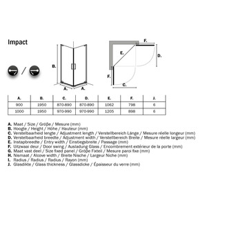 Impact oogt transparant en ruimtelijk en is stijlvol tot in het kleinste detail. Deze draaideur met zijwand is een fraaie aanvulling in iedere badkamer. Maar wat Impact écht bijzonder maakt, is zijn robuuste bouw. Een Impact staat als een huis. Iedere Impact is uitgevoerd met maar liefst 8mm dik veiligheidsglas en gemaakt van de beste materialen, zoals RVS en messing. De inkortbare stabilisatiesteun wordt op 90 graden geplaatst voor maximale stabiliteit. Deze serie is links en rechtsdraaiend te monteren. Door het verstelbare muurprofiel kun je de douchecabine tot 20 mm verstellen,