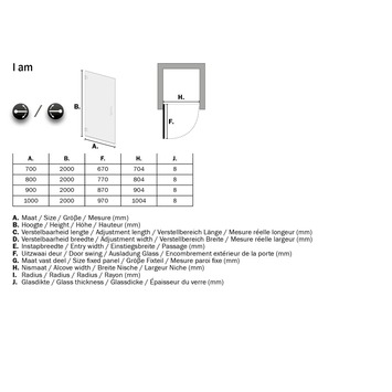 De volledig profielloze serie 'I AM' is met recht een transparante alleskunner. Naast diverse standaard maatvoeringen zijn talloze maatwerkoplossingen mogelijk. Zo kunnen de breedte en hoogte aangepast worden, maar bijvoorbeeld ook eventuele schuintes in de muren of het plafond opgevangen worden. Deze draaideur voor plaatsing in een nis is modern en transparant. Het veiligheidsglas van maar liefst 8mm is altijd voorzien van een antikalk laag waardoor kalk en viezigheid zich minder snel zal hechten. De scharnieren van I AM zijn zelfsluitend. Dat zorgt ervoor dat de deur automatisch naar zijn nulpunt gaat; hij gaat dus vanzelf dicht! Bovendien is dat nulpunt in te stellen. Je kunt je deur dus onder een hoek plaatsen en zo een unieke oplossing maken. De scharnieren en grepen zijn ook beschikbaar in een modern RVS uitstraling en in een unieke matzwarte afwerking.