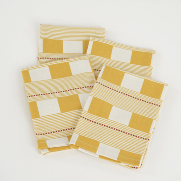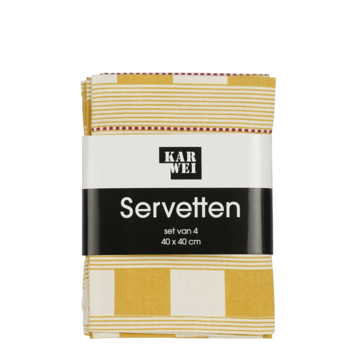 Maak je tafelsetting compleet met deze set van vier servetten in een stijlvolle blockprint. De combinatie van okergeel en witte blokken met subtiele strepen zorgt voor een frisse en moderne uitstraling. Deze servetten hebben een afmeting van L40 x B40 cm, waardoor ze perfect zijn voor een eettafel of een gezellige lunch. Gemaakt van een stevig materiaal, zijn ze praktisch in gebruik en eenvoudig te onderhouden, ideaal voor zowel dagelijks gebruik en speciale gelegenheden.