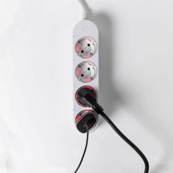 Elk stopcontact ondersteunt tot 12 A met een totaal van 16 A voor de hele strip. De interne beveiligingen beschermen tegen oververhitting, overspanning en overstroom zodat aangesloten apparaten veilig blijven. De led-indicatoren laten met kleuren zien of een apparaat actief is en hoeveel energie wordt gebruikt. Het slanke ontwerp maakt het mogelijk om de strip netjes langs een muur of bureau te plaatsen zonder dat hij in de weg ligt.