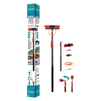 De borstel is verstelbaar in drie standen en past zich aan verschillende oppervlakken aan. Ingeschoven is de steel 1,6 meter lang, wat opbergen praktisch maakt. De softgrip handgreep zorgt voor grip tijdens het werken.