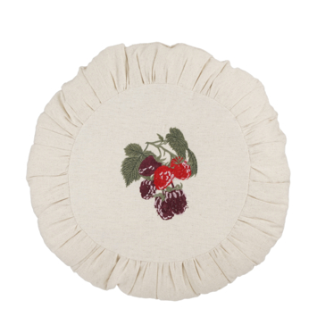 Dit beige sierkussen met bessenpatroon is rondvormig en gemaakt van katoen. Het voelt daarom heerlijk zacht aan en daar lig je lekker en comfortabel op. Maar ook als je het niet gebruikt, is het sierkussen perfect als decoratiestuk om zo de uitstraling bij de bank of het bed te verhogen. Het heeft als afmeting H15 x ø50 cm. Voor een frisse en fruitige sfeer hoef je niet verder te zoeken!