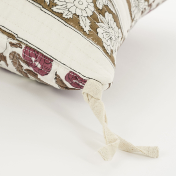 Van de bank tot het bed: dit sierkussen komt overal tot zijn recht! Het kussen heeft een gezellig bloemenmotief en streepmotief in het bruin. Aan de uiteinden van de hoekjes zitten kwastjes die net even wat extra's aan het sierkussen geven. Verder is hij gemaakt van katoen waardoor hij heerlijk zacht is. Praktisch en mooi! De afmetingen van het kussen zijn L35 x B25 x H10 cm.