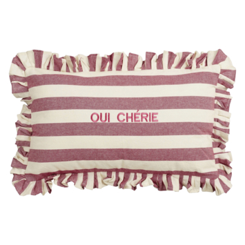 Van het printje en de afwerking van dit sierkussen word je toch vrolijk? Hij is roze-wit gestreept met de tekst 'Oui cherie' erop. De rand heeft leuke ruches die net wat extra's aan het kussen geven. Plaats hem op de bank en je maakt het direct gezellig! Hij is gemaakt van katoen en komt in de afmetingen L55 x B35 x H10 cm.