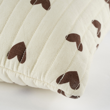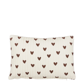 Dit sierkussen is om verliefd op te worden! Dit rechthoekige kussen is wit en heeft een motief van donkerbruine hartjes. Ook heeft hij een geribbelde afwerking: extra schattig detail. Erg leuk om je bank mee op te fleuren of in een kamer met een kleurenthema! Het is handgemaakt van hoogwaardig katoen, waardoor het ook nog eens zacht en comfortabel is om tegenaan te zitten tijdens het lezen of tv-kijken. Verder is de kussenhoes afneembaar door de ritssluiting en heeft het kussen een extra veiligheidskenmerk door de brandvertragende vulling. Plaats het kussen als decoratie op de bank, de fauteuil of op het bed en geniet van dit esthetische item. De lengte is 55 cm, de breedte is 35 cm en de hoogte is 10 cm.