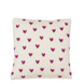 Dit sierkussen is om verliefd op te worden! Het vierkante kussen is wit en heeft een motief van fuchsia hartjes. Ook heeft hij een geribbelde afwerking: extra schattig detail. Erg leuk om je bank mee op te fleuren of in een kamer met een kleurenthema! Het is handgemaakt van hoogwaardig katoen, waardoor het ook nog eens zacht en comfortabel is om tegenaan te zitten tijdens het lezen of tv-kijken. Verder is de kussenhoes afneembaar door de ritssluiting en heeft het kussen een extra veiligheidskenmerk door de brandvertragende vulling. Plaats het kussen als decoratie op de bank, de fauteuil of op het bed en geniet van dit esthetische item. De lengte is 45 cm, de breedte is 45 cm en de hoogte is 10 cm.