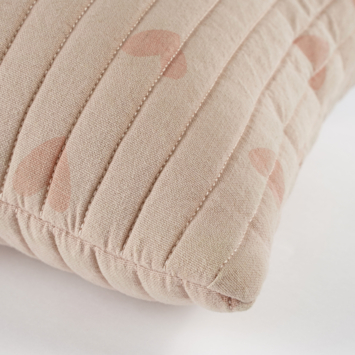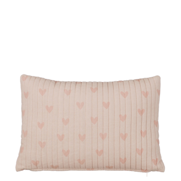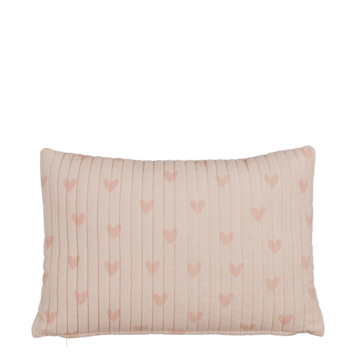 Dit sierkussen is om verliefd op te worden! Dit rechthoekige kussen is lichtroze en heeft een motief van donkerroze hartjes. Ook heeft hij een geribbelde afwerking: extra schattig detail. Erg leuk om je bank mee op te fleuren of in een kamer met een kleurenthema! Het is handgemaakt van hoogwaardig katoen, waardoor het ook nog eens zacht en comfortabel is om tegenaan te zitten tijdens het lezen of tv-kijken. Verder is de kussenhoes afneembaar door de ritssluiting en heeft het kussen een extra veiligheidskenmerk door de brandvertragende vulling. Plaats het kussen als decoratie op de bank, de fauteuil of op het bed en geniet van dit esthetische item. De lengte is 55 cm, de breedte is 35 cm en de hoogte is 10 cm.